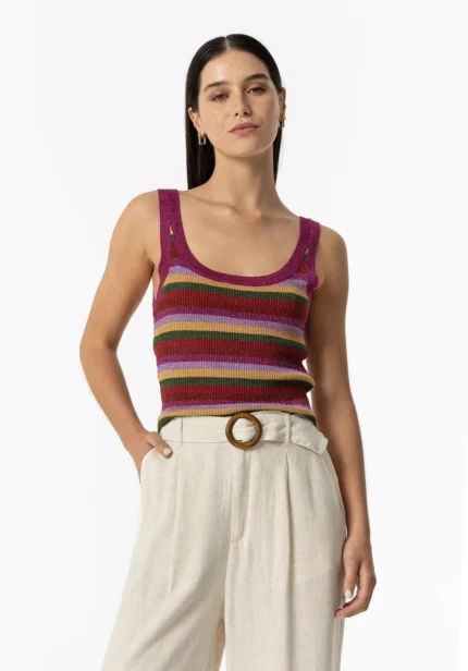 BRAND:TIFFOSI COLOUR:COLOURED  Πλεκτό τοπ με στρογγυλή λαιμόκοψη και τιράντες. Εφαρμογή μεταλλικού νήματος σε συνδυασμό με αντίθεση. 92% ΒΙΣΚΟΖΗ 8% ΜΕΤΑΛΛΙΚΗ
