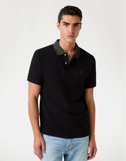 GUESS MENS POLO BLACK WITH NECK ALL OVER PRINT