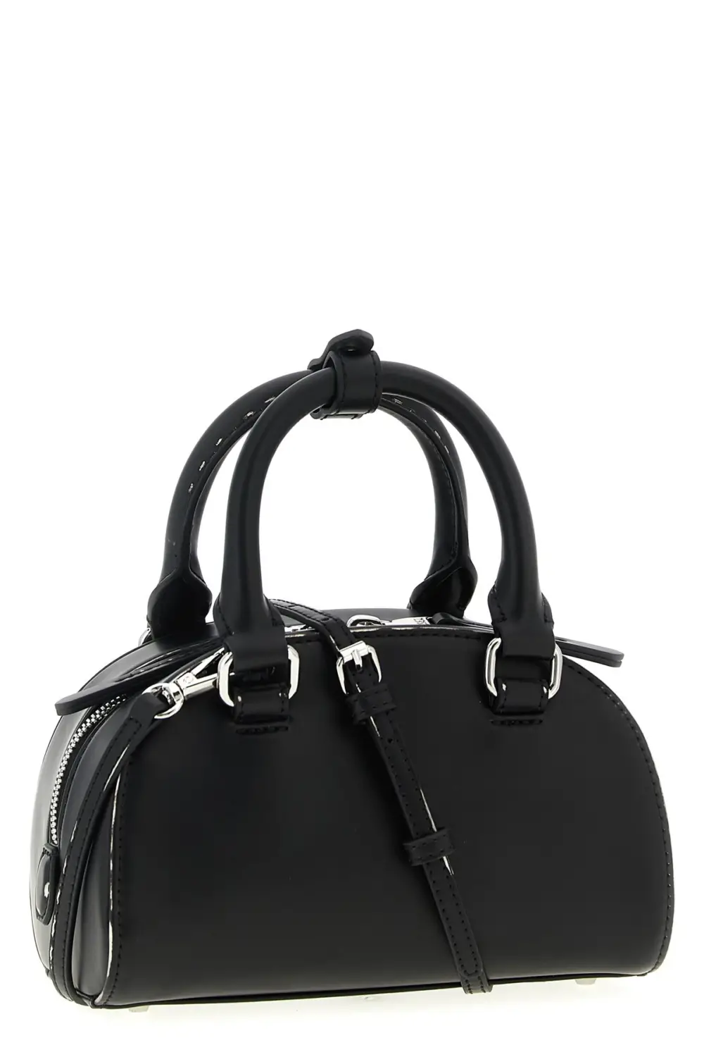 - The front of the bag is adorned with a monumental, raised monogram in a sculptural motif, subtly accented with contrasting white stitching that adds a modern, almost architectural character to the overall design. Silvery metal elements and a bold zipper elegantly complement the deep black material, lending sophistication to the bag. Sturdy, short handles ensure comfortable carrying by hand.