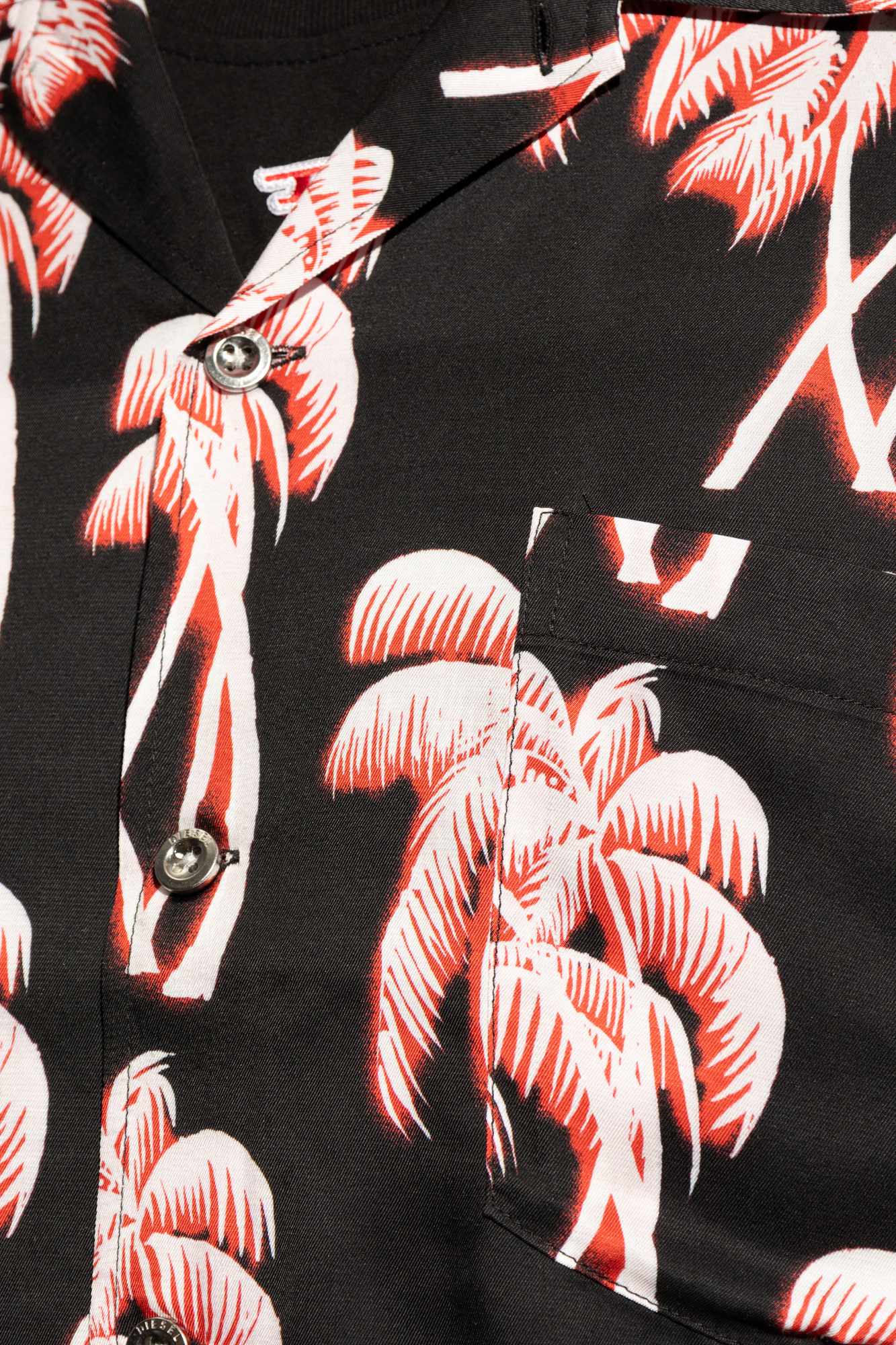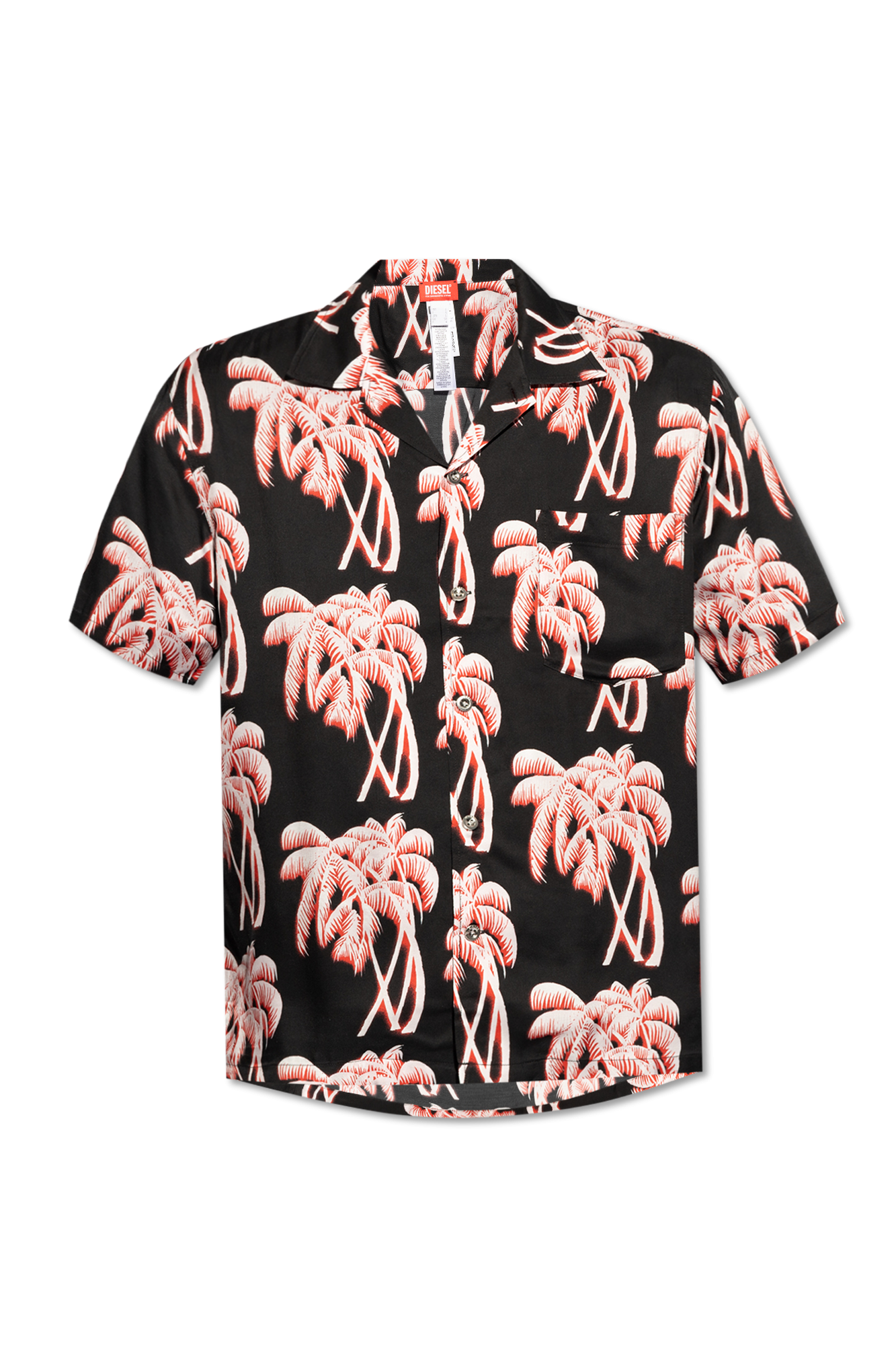 Black ‘BMOWT-ADRIAN’ shirt from Diesel. Fastened with buttons, this loose-fitting design features a red and white palm pattern, collar, short sleeves, front pocket and logo print.