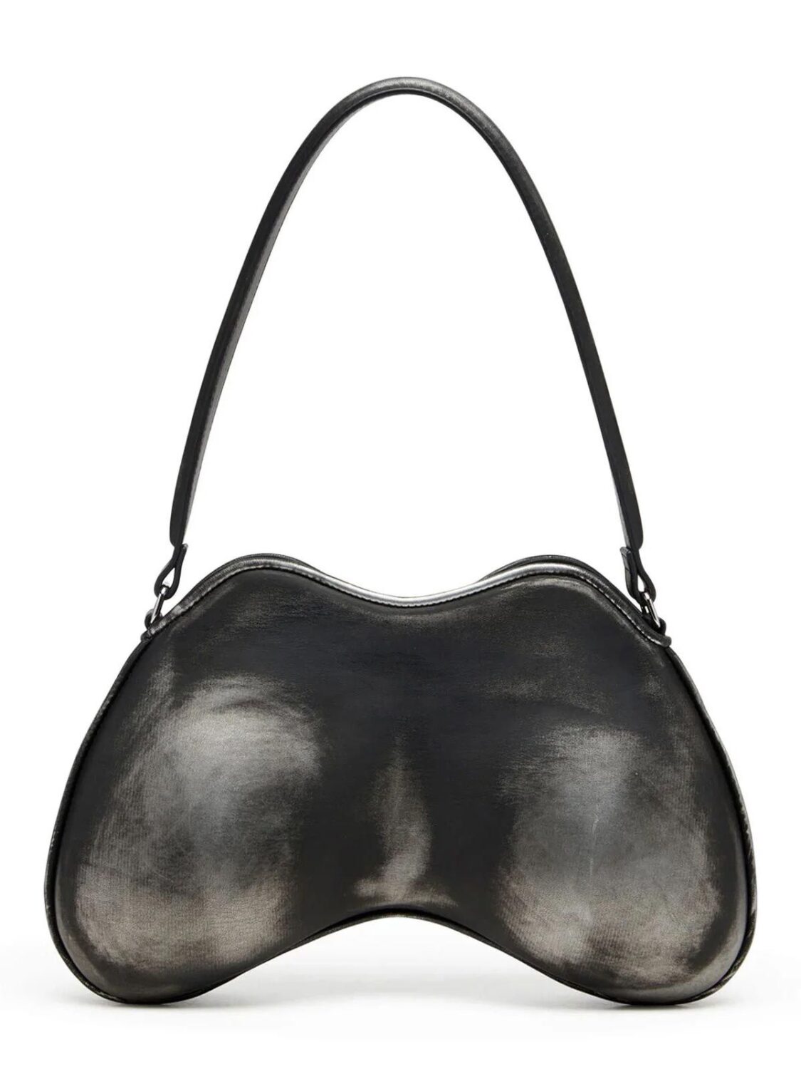- A three-dimensional take on the coveted Play, this new iteration of the iconic controller-shaped bag is cheekily dubbed the ‘Double D’. Provocative and suggestively buxom, it has a soft-touch rigid construction in ultra glossy pull-up : where the material is stretched over the roundness of the bag, it creates a dégradé fade, translating into an incredible depth of colour. The front panel is decorated with a metal Oval D rivet. The organic shape is ultra-comfortable to carry under the arm and has a fixed shoulder strap.