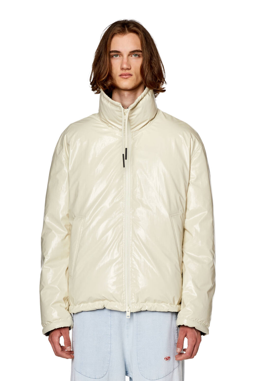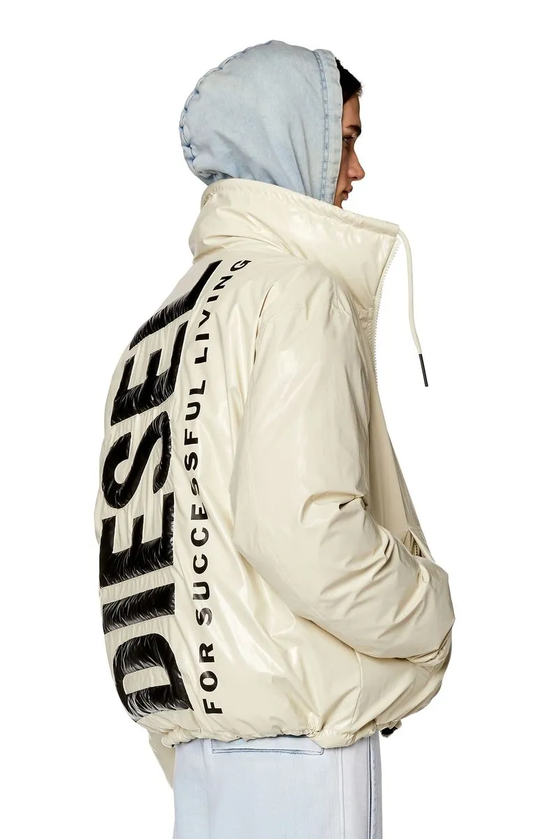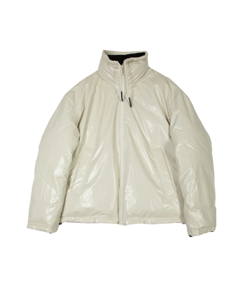 - This men’s winter jacket is made from glossy laminated nylon and insulated with padding that mimics down. Cut in a loose shape, it has a protective stand collar cinchable with a drawstring and a supersized logo emblazoning the back.