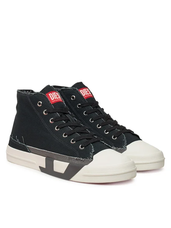 • A high-top style, these men’s canvas sneakers feature a bold take on Diesel’s iconic red D logo. The originally tiny emblem is rendered in a dual fabric and rubber design that’s split between the upper and sole in blown-up proportions. The shoes are frayed and hand-distressed with dirty-effect smudging, lending them a worn, beaten-up feel.