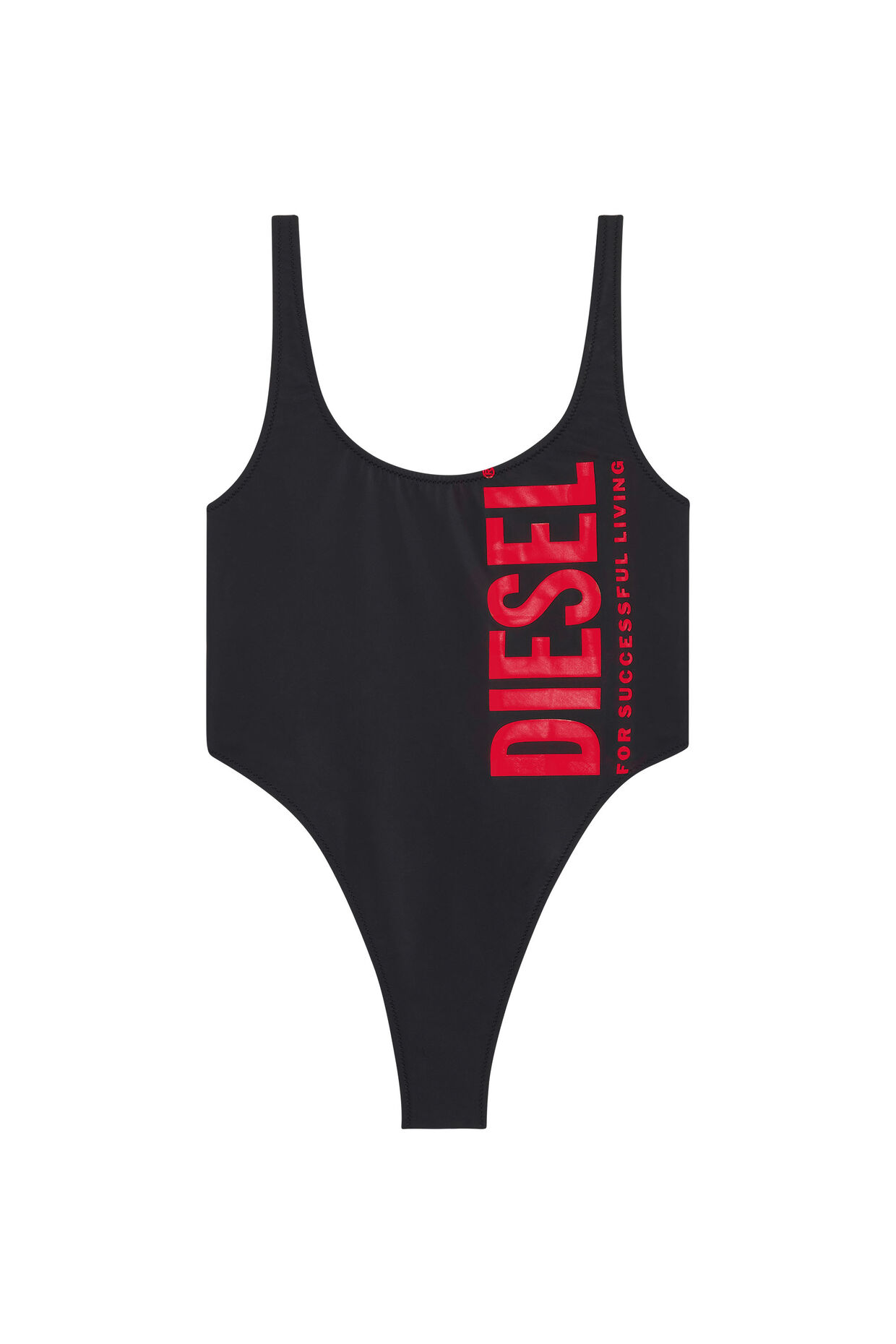 Scoop-back swimming costume cut from recycled nylon Lycra, engineered with compression and shape-retention technology, UV protection and enhanced chlorine and sun cream resistance. Branded with a maxi Diesel For Successful Living print.