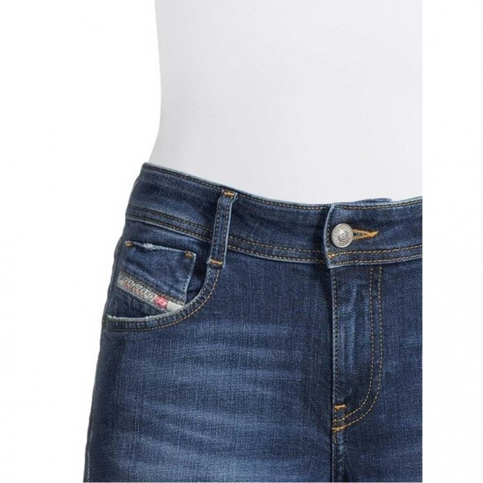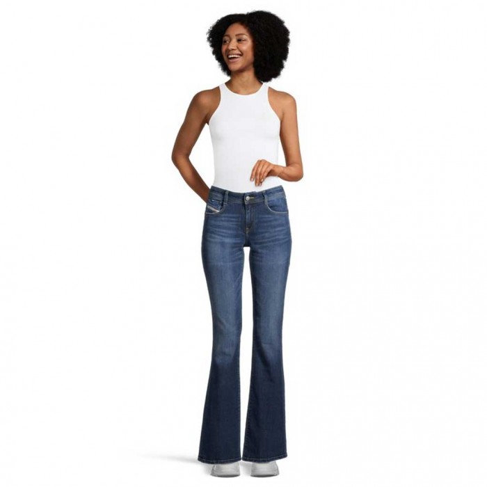 • Bootcut style with a low waist and higher back coverage. This classic slim jean with a bohemien attitude hugs the body from the hips to the knees. Made from stretch denim with partly recycled cotton in an intense dark blue wash with subtle treatments. By buying cotton products from Diesel, you’re supporting responsible cotton production through Better Cotton.