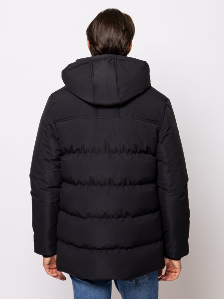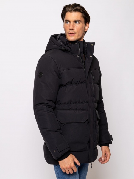 - Men’s quilted winter coat in water-repellent fabric with straight cut, adjustable bottom, detachable and adjustable hood, adjustable sleeve hem, ribbed bottom cuffs, zip fastening, outer patent wind flap.