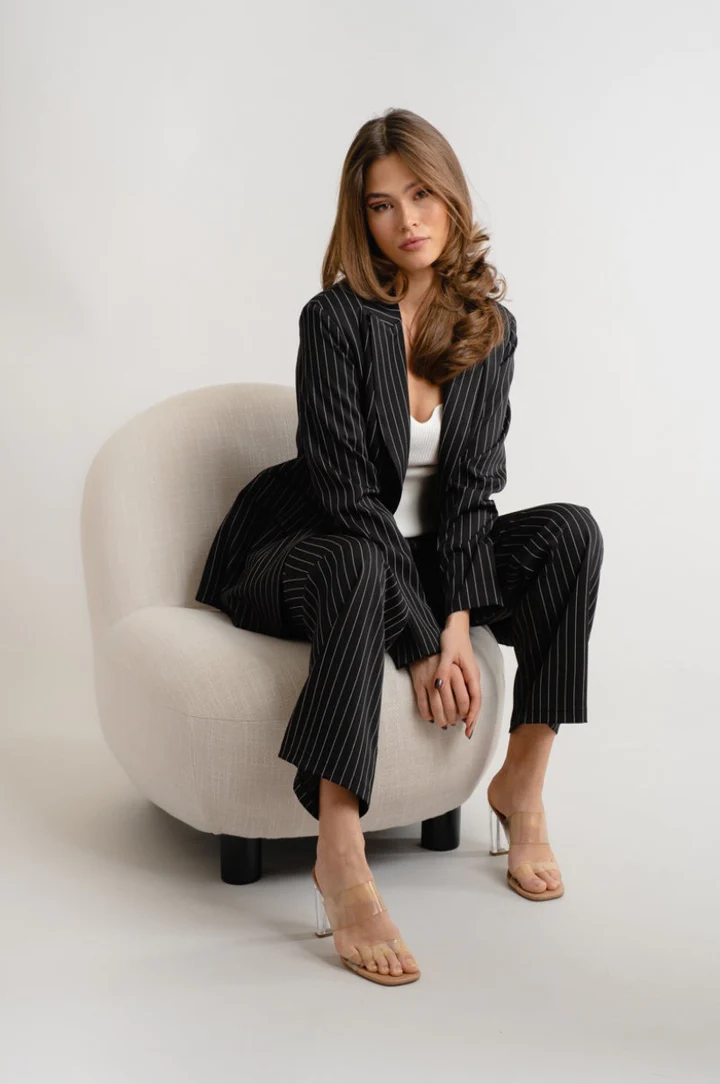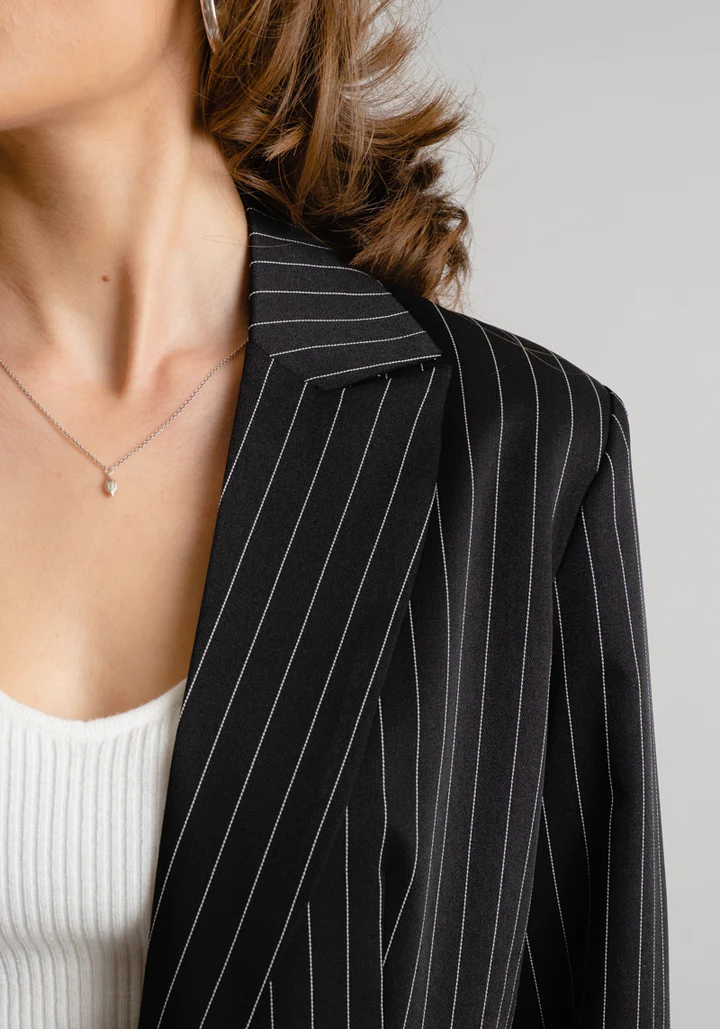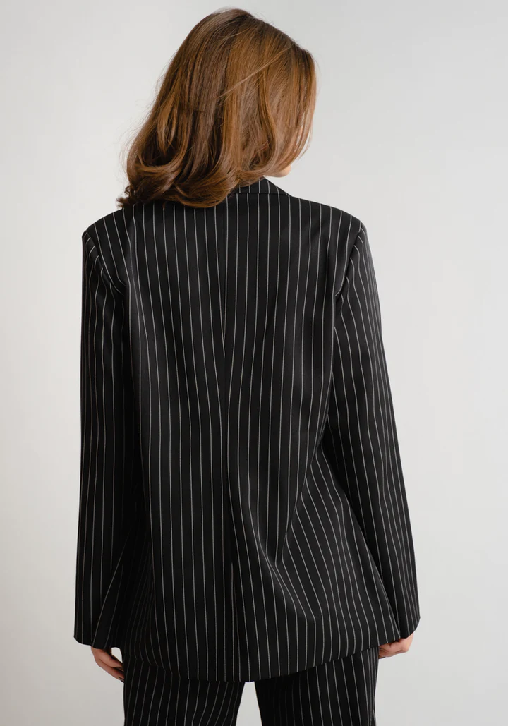 A perfect classic black blazer with white narrow stripes. With one button for closing and two pockets in the front. Match it together with Freya pants or the Freya tube dress to complete the look! The modell is 171cm tall and she is wearing size S.