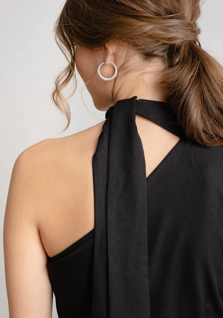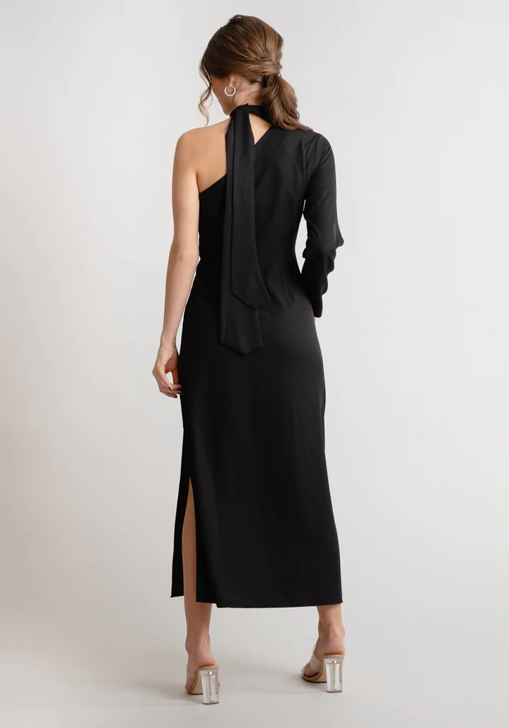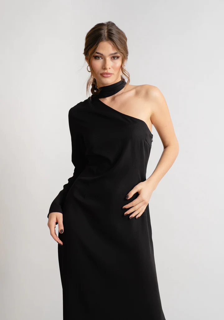 • A long elegant one shoulder dress in black with one long sleeve. There is two band to tie at the neck as a choker. The modell is 171cm tall and she is wearing size S. Materials: 100% Polyester