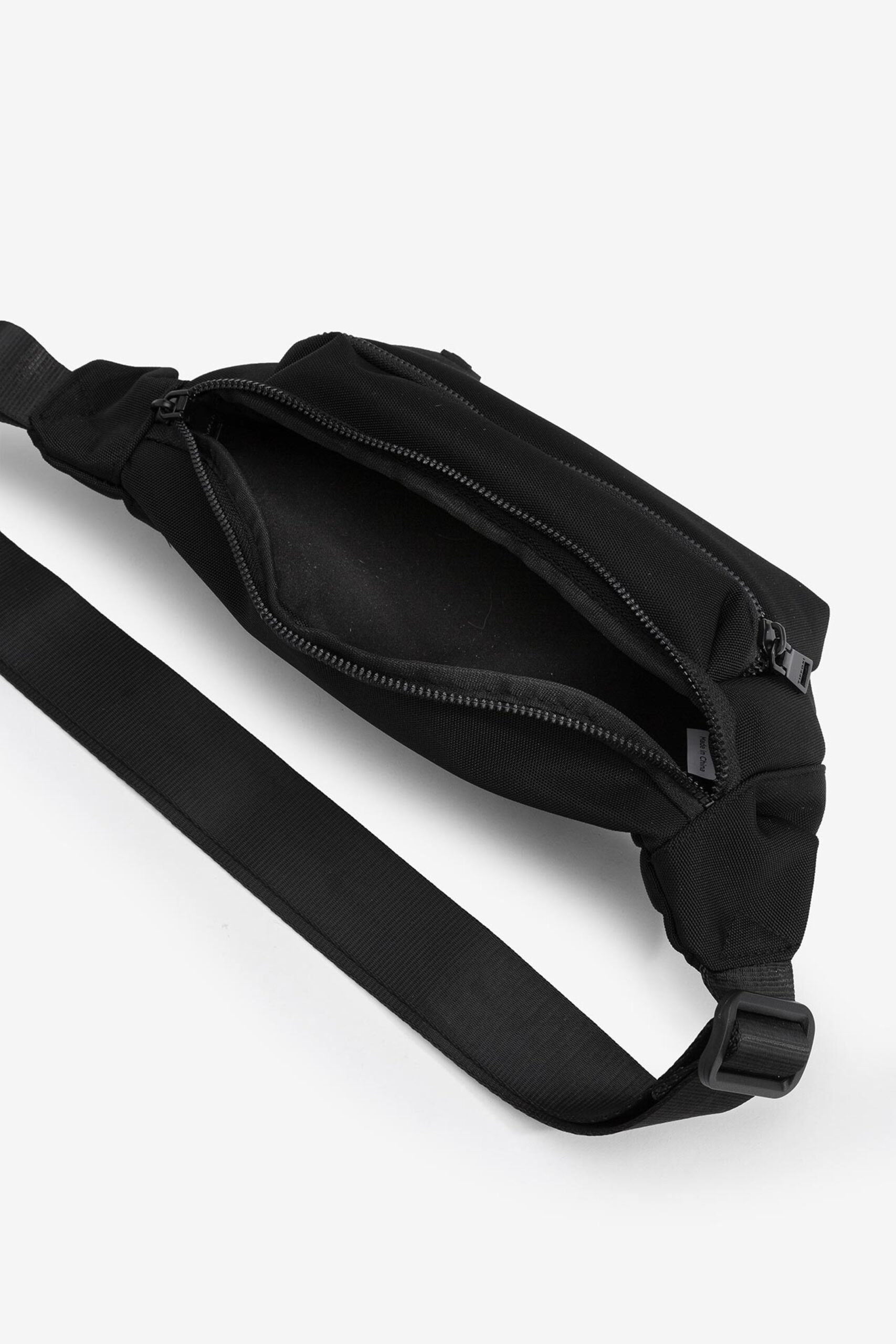 • Sleek black waist bag with front pocket, zip closures, and adjustable strap for versatile wear.