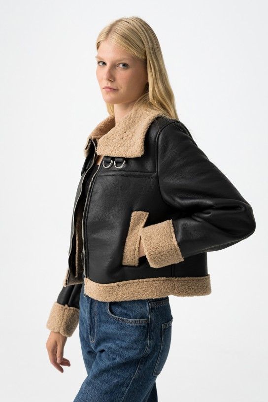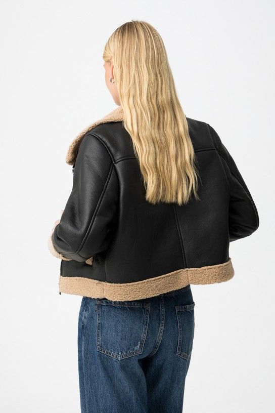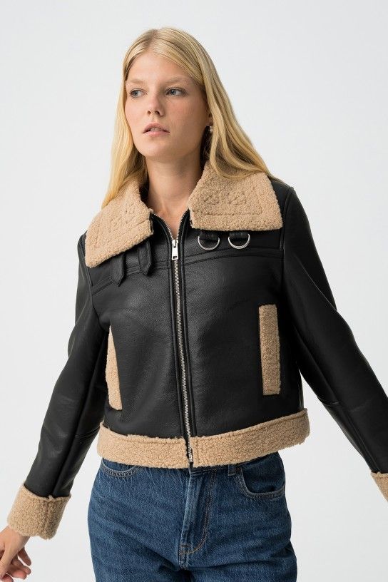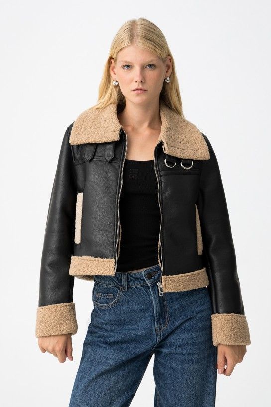 Regular fit faux leather jacket combined with synthetic sherpa, zipper closure, two front pockets. Collar with buckles and long sleeves.
