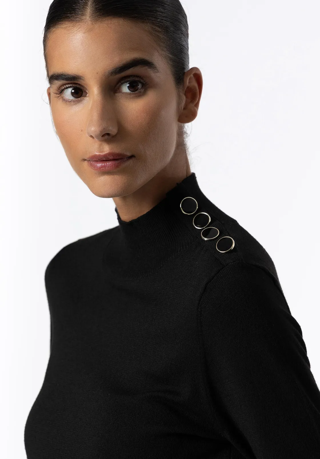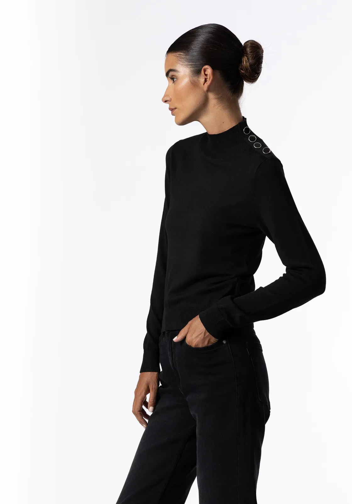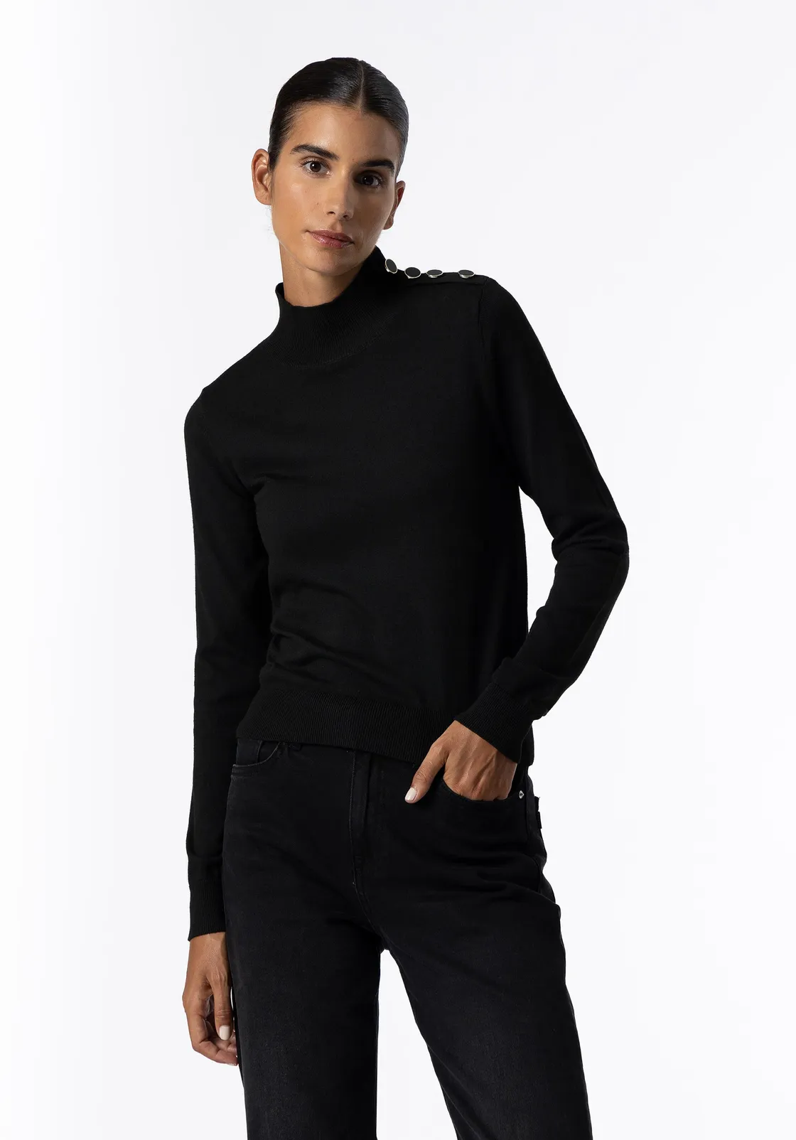 Πλεκτό πουλόβερ με ψηλό λαιμό και μακριά μανίκια. Εφαρμογή πλαστών κουμπιών στον ώμο.