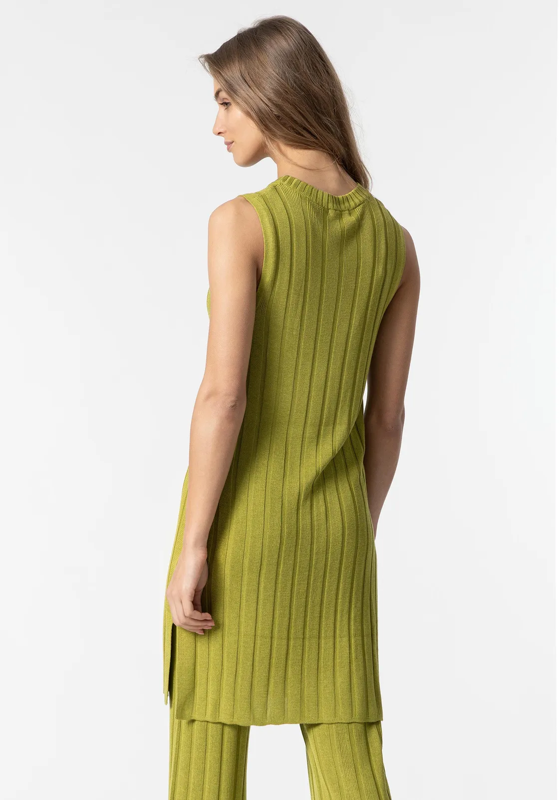 Πλεκτό τοπ με στρογγυλή λαιμόκοψη και μανίκια μασχάλης. Κάτω με πλαϊνά ανοίγματα.